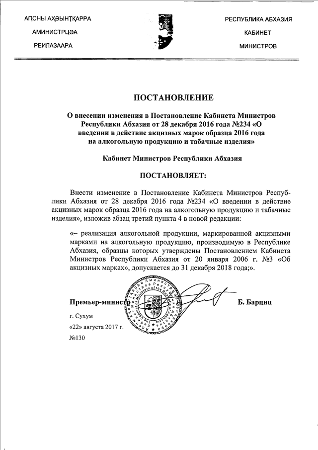 Постановление Кабинета Министров Республики Абхазия от 22.08.2017 № 130 "О внесении изменения в Постановление Кабинета Министров Республики Абхазия от 28 декабря 2016 года № 234 "О введении в действие акцизных марок образца 2016 года на алкогольную продукцию и табачные изделия"