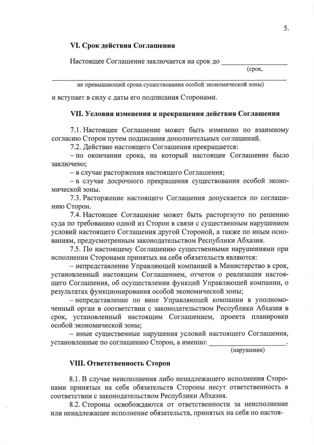 Постановление Кабинета Министров Республики Абхазия от 15.09.2017 № 131 "Об установлении "Примерной формы Соглашения, заключаемого уполномоченным органом с управляющей компанией, об управлении особой экономической зоной"