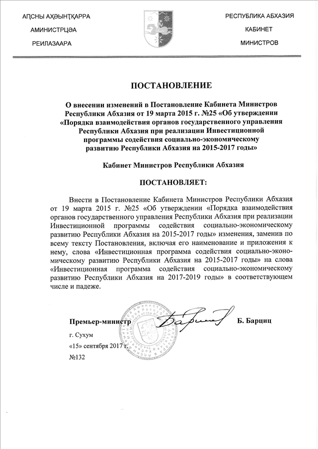 Постановление Кабинета Министров Республики Абхазия от 15.09.2017 № 132 "О внесении изменений в Постановление Кабинета Министров Республики Абхазия от 19 марта 2015 г. № 25 "Об утверждении "Порядка взаимодействия органов государственного управления Республики Абхазия при реализации Инвестиционной программы содействия социально-экономическому развитию Республики Абхазия на 2015-2017 годы"