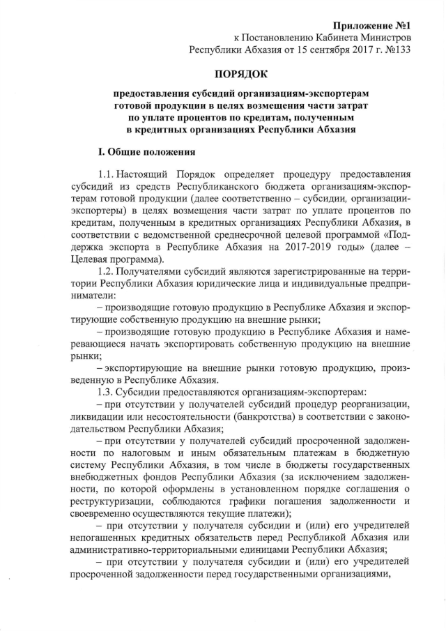 Постановление Кабинета Министров Республики Абхазия от 15.09.2017 № 133 "О порядке предоставления субсидий организациям-экспортерам в рамках целевой программы поддержки экспорта в Республике Абхазия на 2017-2019 годы"