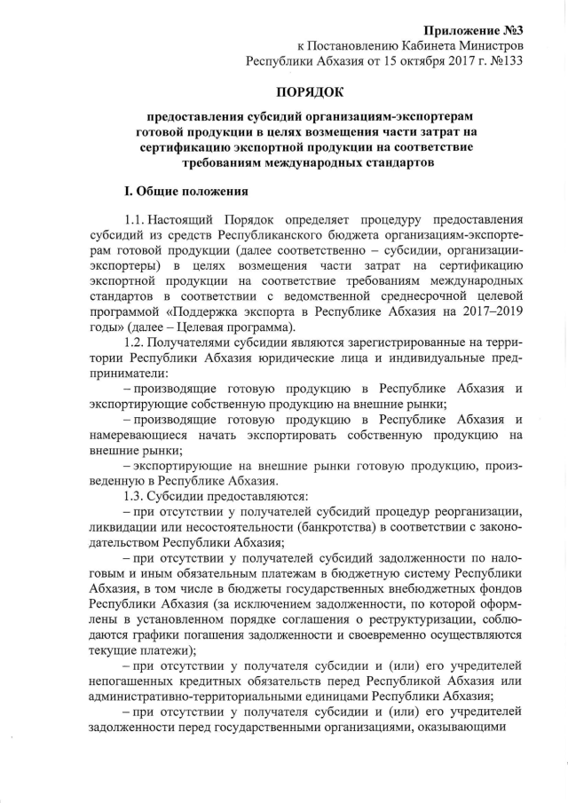 Постановление Кабинета Министров Республики Абхазия от 15.09.2017 № 133 "О порядке предоставления субсидий организациям-экспортерам в рамках целевой программы поддержки экспорта в Республике Абхазия на 2017-2019 годы"