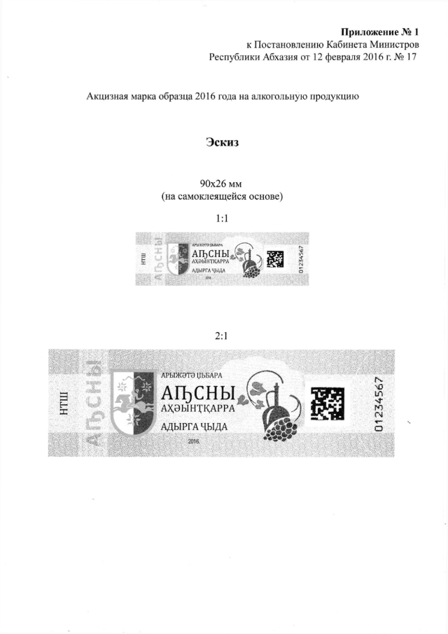 Постановление Кабинета Министров Республики Абхазия от 12.02.2016 № 17 "Об утверждении акцизных марок образца 2016 года на алкогольную продукцию и табачные изделия"