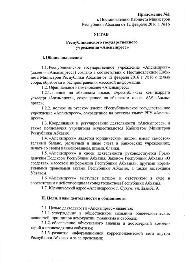 Постановление Кабинета Министров Республики Абхазия от 12.02.2016 № 16 "О Республиканском государственном учреждении "Апсныпресс"
