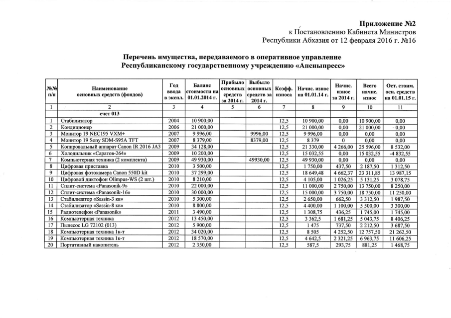 Постановление Кабинета Министров Республики Абхазия от 12.02.2016 № 16 "О Республиканском государственном учреждении "Апсныпресс"