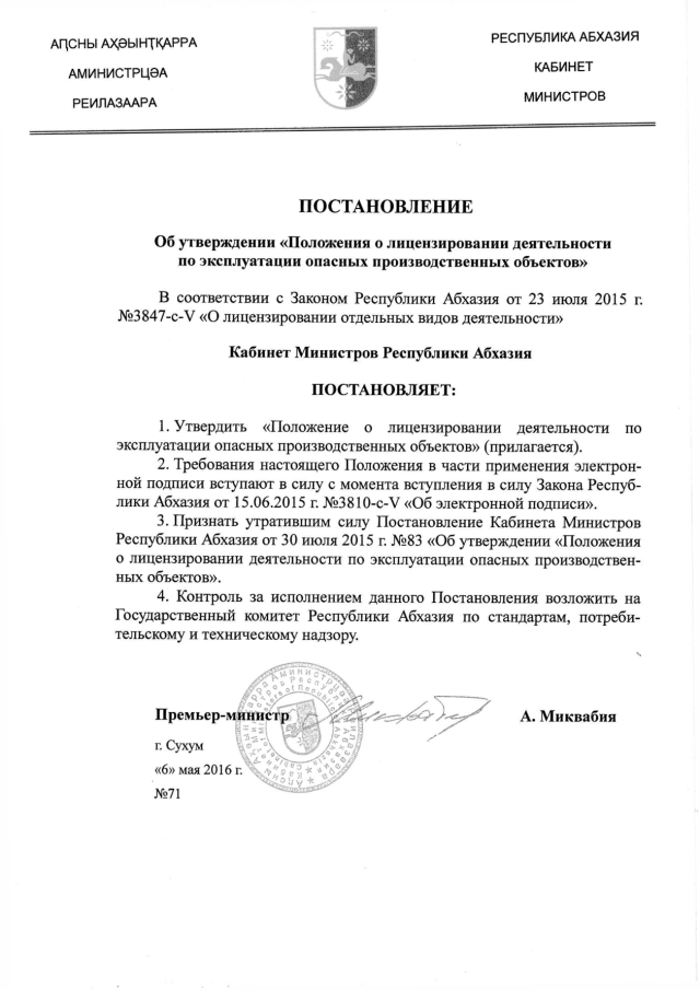 Постановление Кабинета Министров Республики Абхазия от 06.05.2016 № 71 "Об утверждении "Положения о лицензировании деятельности по эксплуатации опасных производственных объектов"