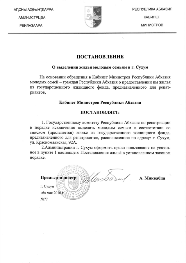 Постановление Кабинета Министров Республики Абхазия от 06.05.2016 № 77 "О выделении жилья молодым семьям в г. Сухум"
