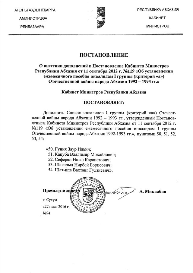 Постановление Кабинета Министров Республики Абхазия от 27.05.2016 № 94 "О внесении дополнений в Постановление Кабинета Министров Республики Абхазия от 11 сентября 2012 г. № 119 "Об установлении ежемесячного пособия инвалидам I группы (критерий "а") Отечественной войны народа Абхазии 1992-1993 гг."