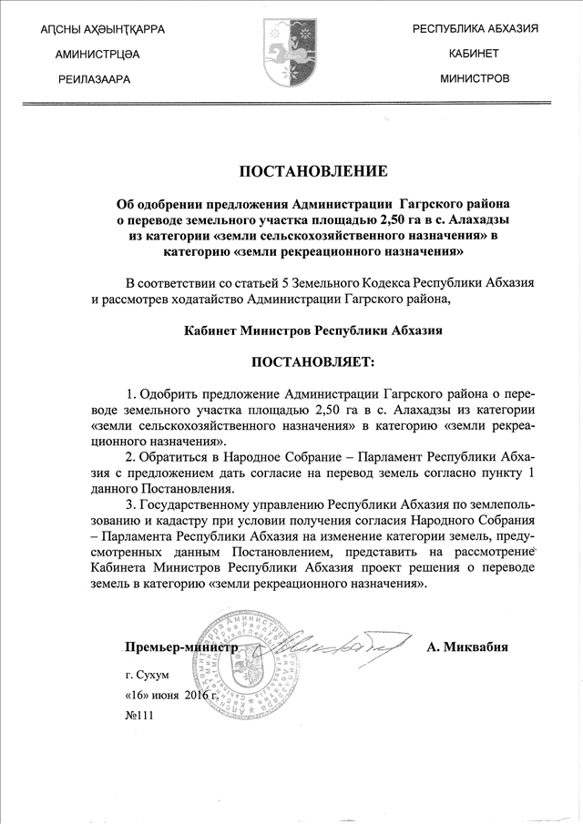 Постановление Кабинета Министров Республики Абхазия от 16.06.2016 № 111 "Об одобрении предложения Администрации Гагрского района о переводе земельного участка площадью 2,50 га в с. Алахадзы из категории "земли сельскохозяйственного назначения" в категорию "земли рекреационного назначения"