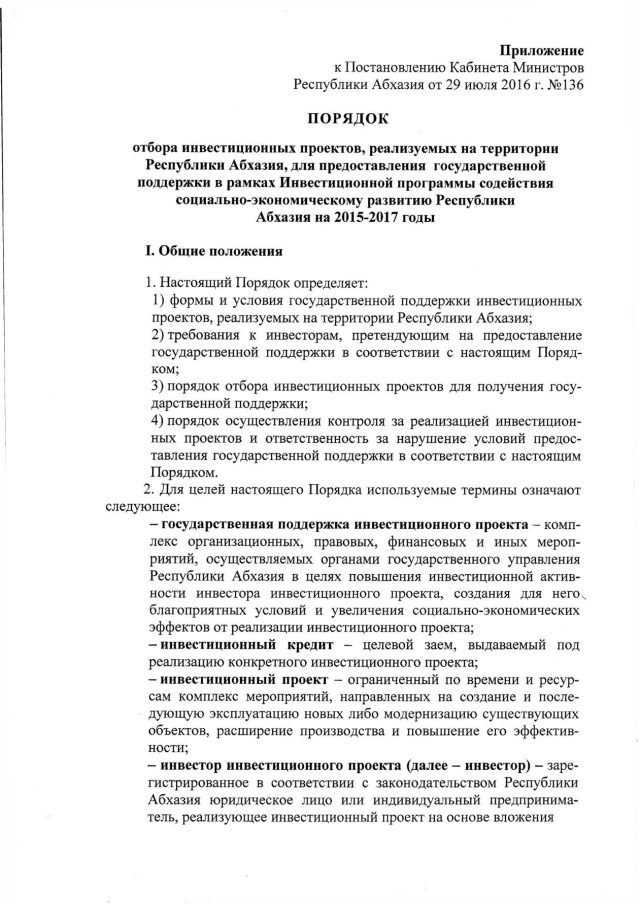 Постановление Кабинета Министров Республики Абхазия от 29.07.2016 № 136 "О мерах государственной поддержки инвестиционных проектов, реализуемых на территории Республики Абхазия в рамках Инвестиционной программы содействия социально-экономическому развитию Республики Абхазия на 2015-2017 годы"