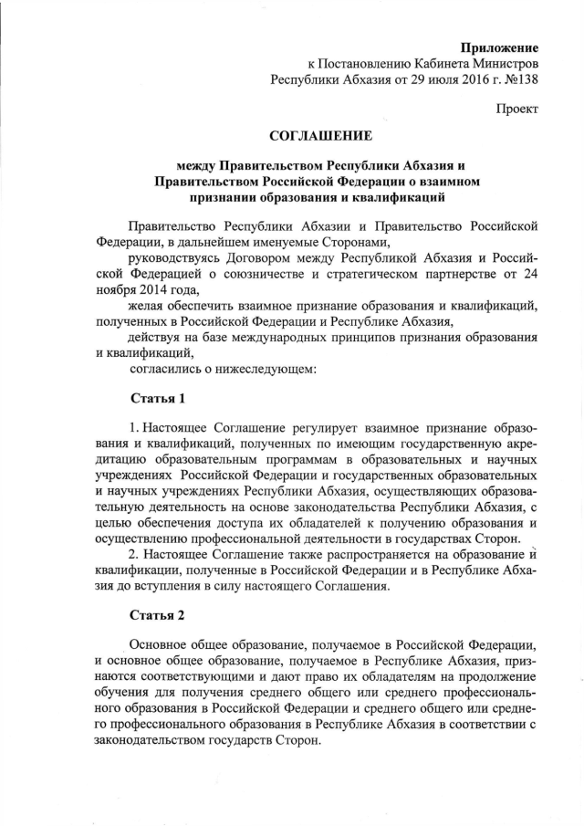 Постановление Кабинета Министров Республики Абхазия от 29.07.2016 № 138 "О проекте Соглашения между Правительством Республики Абхазия и Правительством Российской Федерации о взаимном признании образования и квалификаций"
