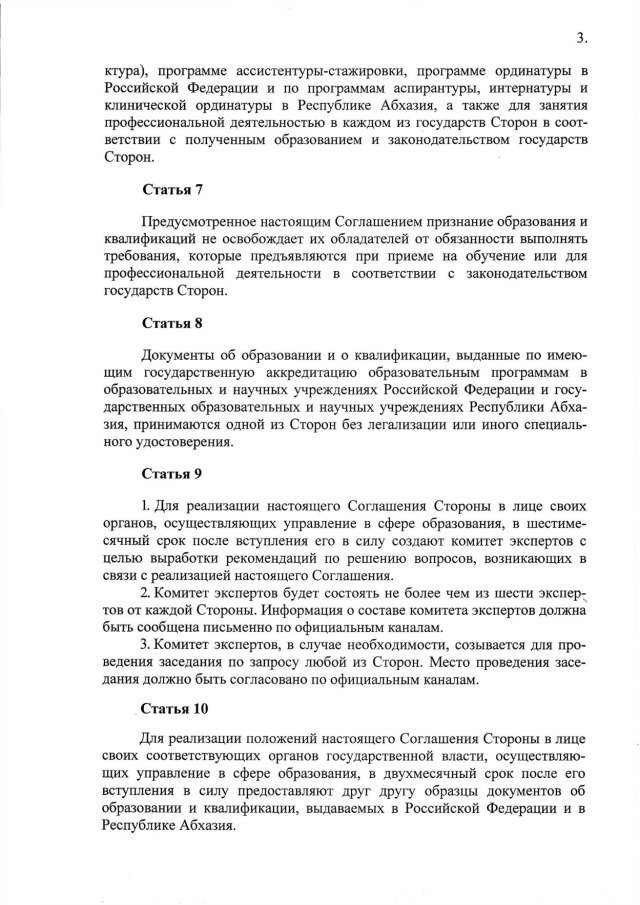 Постановление Кабинета Министров Республики Абхазия от 29.07.2016 № 138 "О проекте Соглашения между Правительством Республики Абхазия и Правительством Российской Федерации о взаимном признании образования и квалификаций"