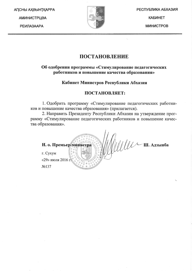 Постановление Кабинета Министров Республики Абхазия от 29.07.2016 № 137 "Об одобрении программы "Стимулирование педагогических работников и повышение качества образования"