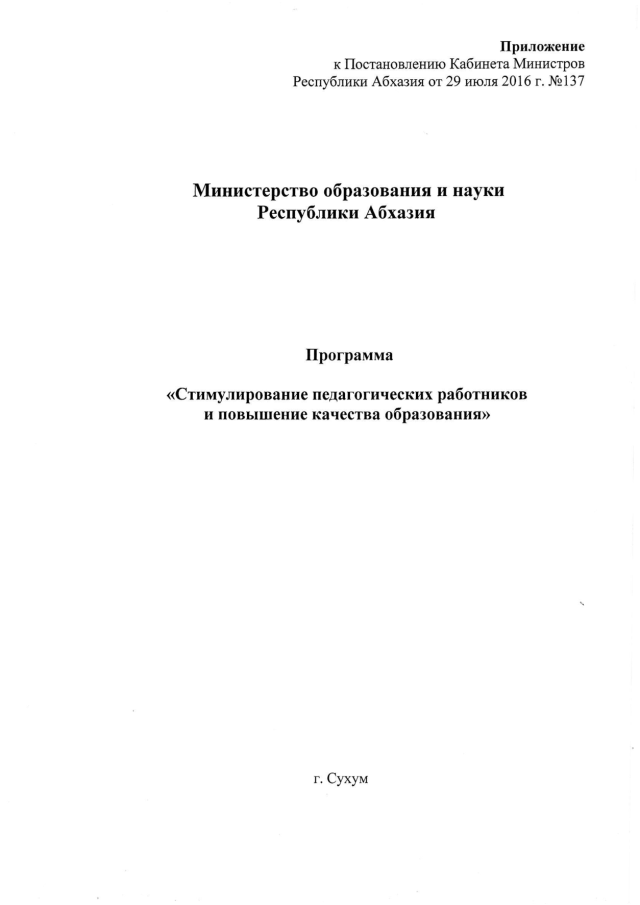 Постановление Кабинета Министров Республики Абхазия от 29.07.2016 № 137 "Об одобрении программы "Стимулирование педагогических работников и повышение качества образования"