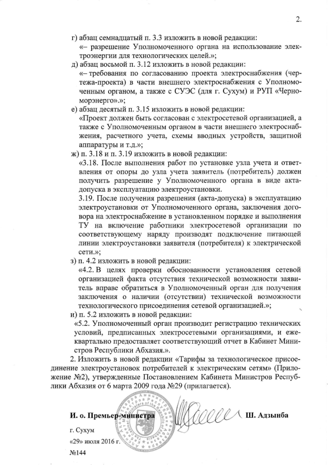 Постановление Кабинета Министров Республики Абхазия от 29.07.2016 № 144 "О внесении изменений в Постановление Кабинета Министров Республики Абхазия от 6 марта 2009 года № 29 "Об утверждении "Положения по технологическому присоединению к электрическим сетям энергосистемы Республики Абхазия" и "Тарифов за технологическое присоединение электроустановок потребителей к электрическим сетям"