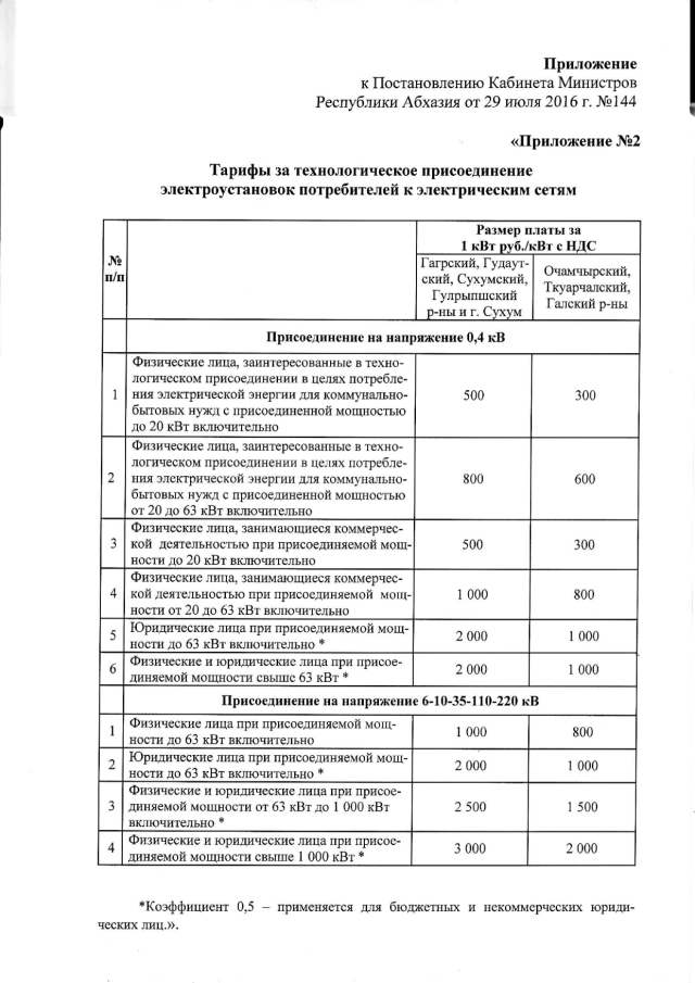Постановление Кабинета Министров Республики Абхазия от 29.07.2016 № 144 "О внесении изменений в Постановление Кабинета Министров Республики Абхазия от 6 марта 2009 года № 29 "Об утверждении "Положения по технологическому присоединению к электрическим сетям энергосистемы Республики Абхазия" и "Тарифов за технологическое присоединение электроустановок потребителей к электрическим сетям"