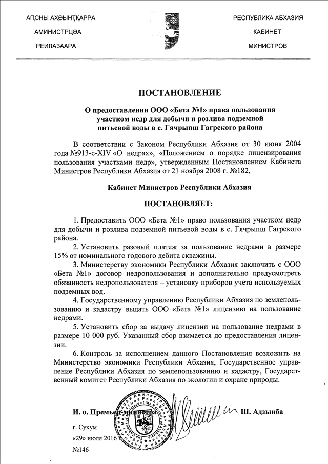 Постановление Кабинета Министров Республики Абхазия от 29.07.2016 № 146 "О предоставлении ООО "Бета № 1" права пользования участком недр для добычи и розлива подземной питьевой воды в с. Гячрыпш Гагрского района"