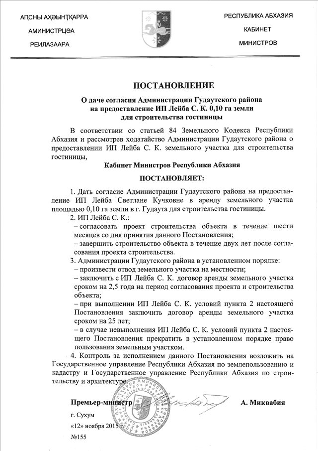 Постановление Кабинета Министров Республики Абхазия от 12.11.2015 № 155 "О даче согласия Администрации Гудаутского района на предоставление ИП Лейба С.К. 0,10 га земли для строительства гостиницы"