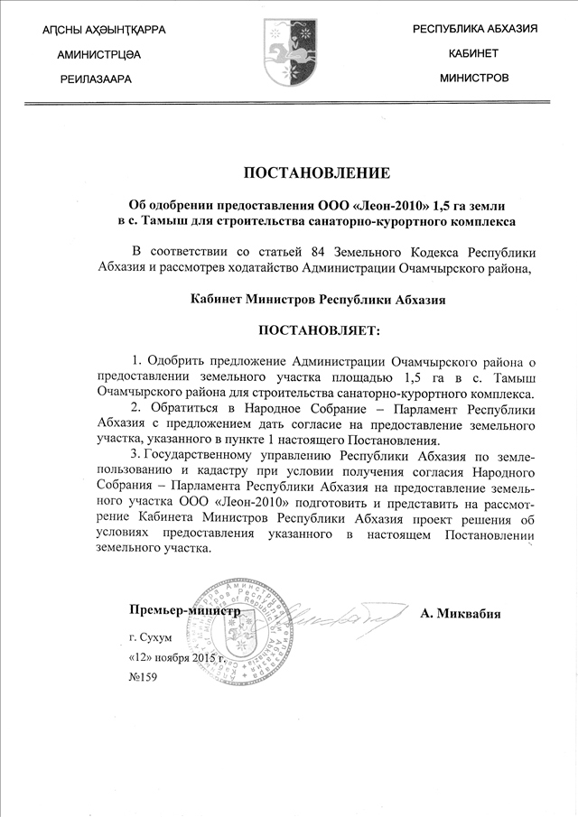 Постановление Кабинета Министров Республики Абхазия от 12.11.2015 № 159 "Об одобрении предоставления ООО "Леон-2010" 1,5 га земли в с. Тамыш для строительства санаторно-курортного комплекса"