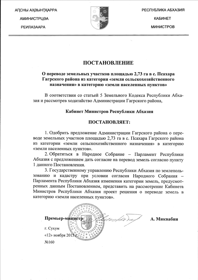 Постановление Кабинета Министров Республики Абхазия от 12.11.2015 № 160 "О переводе земельных участков площадью 2,73 га в с. Псахара Гагрского района из категории "земли сельскохозяйственного назначения" в категорию "земли населенных пунктов"