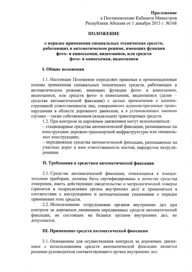 Постановление Кабинета Министров Республики Абхазия от 01.12.2015 № 168 "Об утверждении "Положения о порядке применения специальных технических средств, работающих в автоматическом режиме, имеющих функции фото- и киносъемки, видеозаписи, или средств фото- и киносъемки, видеозаписи"