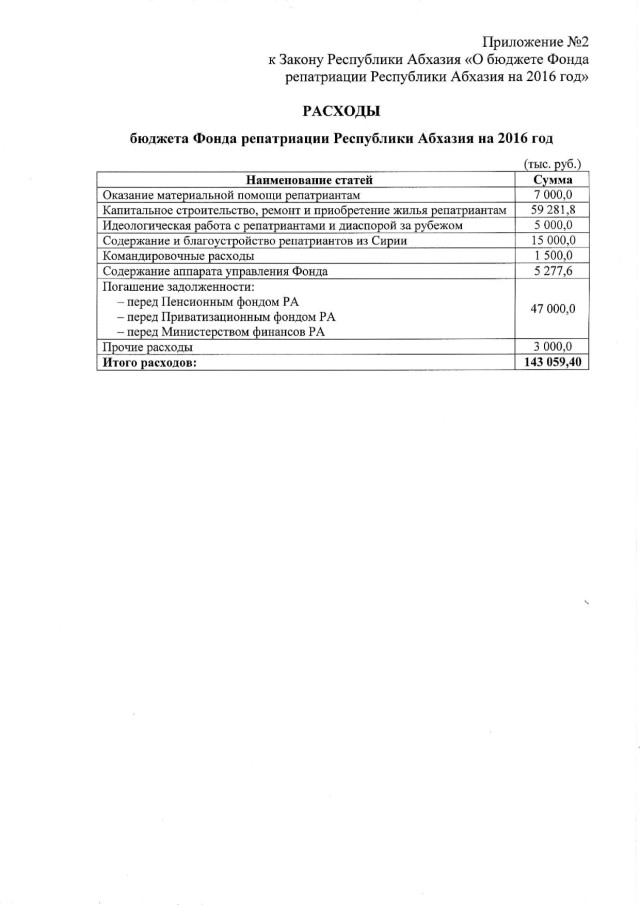 Постановление Кабинета Министров Республики Абхазия от 01.12.2015 № 169 "О проекте Закона Республики Абхазия "О бюджете Фонда репатриации Республики Абхазия на 2016 год", утверждении штатного расписания и сметы расходов аппарата управления Фонда репатриации Республики Абхазия на 2016 год"