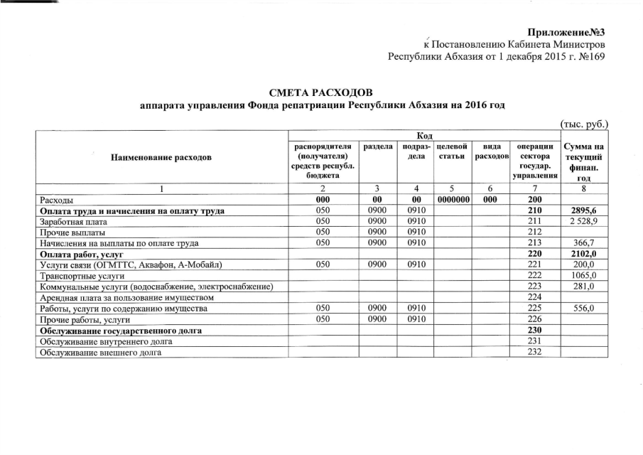 Постановление Кабинета Министров Республики Абхазия от 01.12.2015 № 169 "О проекте Закона Республики Абхазия "О бюджете Фонда репатриации Республики Абхазия на 2016 год", утверждении штатного расписания и сметы расходов аппарата управления Фонда репатриации Республики Абхазия на 2016 год"
