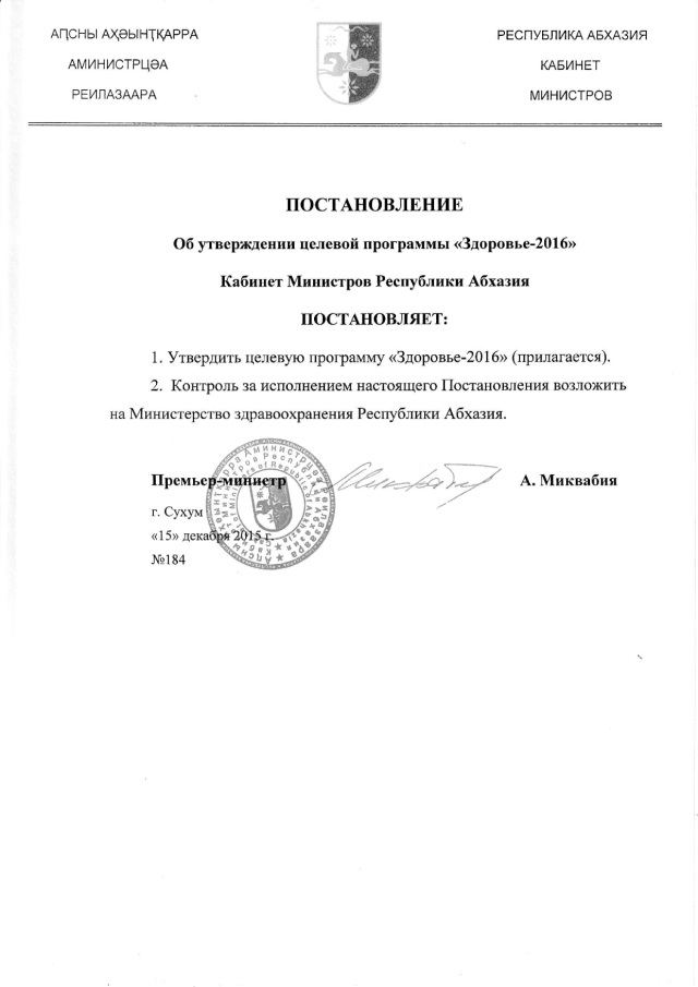 Постановление Кабинета Министров Республики Абхазия от 15.12.2015 № 184 "Об утверждении целевой программы "Здоровье-2016"