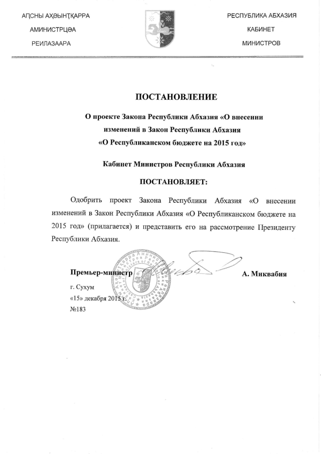 Постановление Кабинета Министров Республики Абхазия от 15.12.2015 № 183 "О проекте Закона Республики Абхазия "О внесении изменений в Закон Республики Абхазия "О Республиканском бюджете на 2015 год"