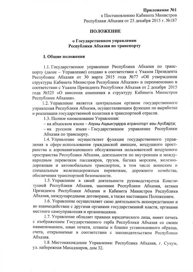 Постановление Кабинета Министров Республики Абхазия от 23.12.2015 № 187 "Об утверждении "Положения о Государственном управлении Республики Абхазия по транспорту"