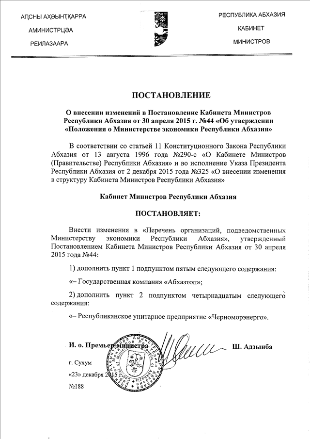 Постановление Кабинета Министров Республики Абхазия от 23.12.2015 № 188 "О внесении изменений в Постановление Кабинета Министров Республики Абхазия от 30 апреля 2015 г. № 44 "Об утверждении "Положения о Министерстве экономики Республики Абхазия"