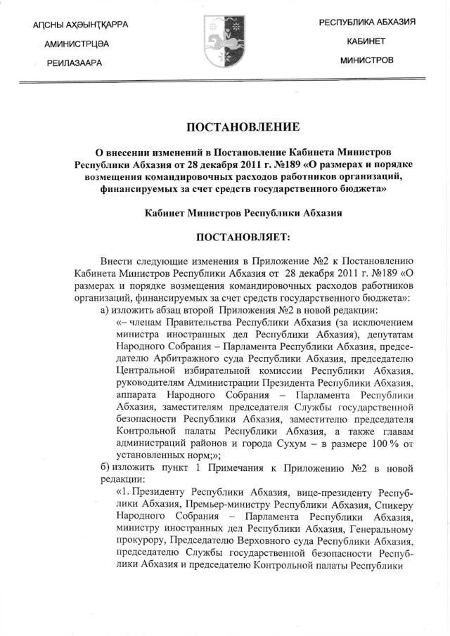 Постановление Кабинета Министров Республики Абхазия от 28.12.2015 № 198/1 "О внесении изменений в Постановление Кабинета Министров Республики Абхазия от 28 декабря 2011 г. № 189 "О размерах и порядке возмещения командировочных расходов работников организаций, финансируемых за счет средств государственного бюджета"