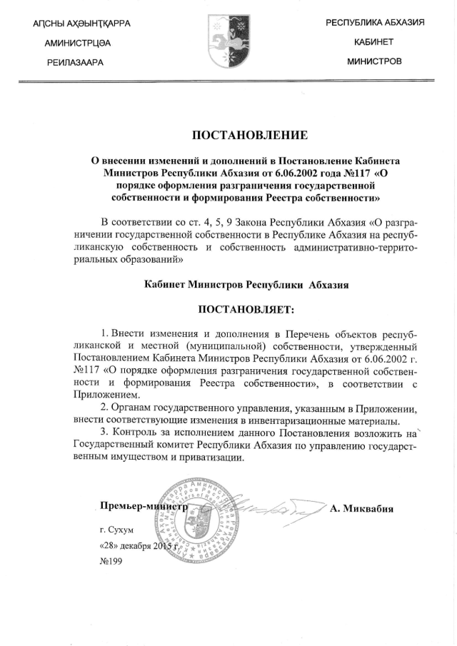 Постановление Кабинета Министров Республики Абхазия от 28.12.2015 № 199 "О внесении изменений и дополнений в Постановление Кабинета Министров Республики Абхазия от 6.06.2002 года № 117 "О порядке оформления разграничения государственной собственности и формирования Реестра собственности"