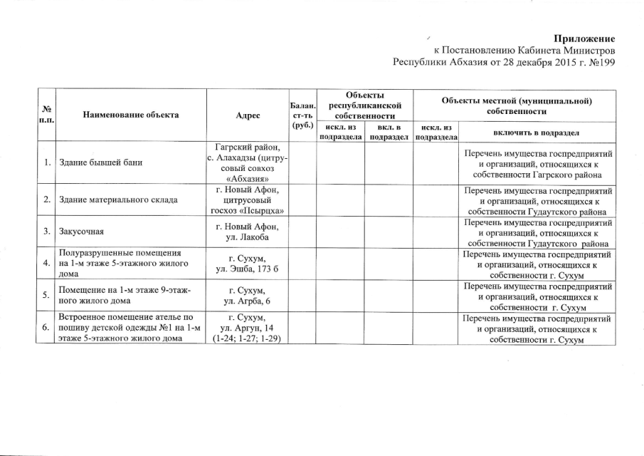 Постановление Кабинета Министров Республики Абхазия от 28.12.2015 № 199 "О внесении изменений и дополнений в Постановление Кабинета Министров Республики Абхазия от 6.06.2002 года № 117 "О порядке оформления разграничения государственной собственности и формирования Реестра собственности"