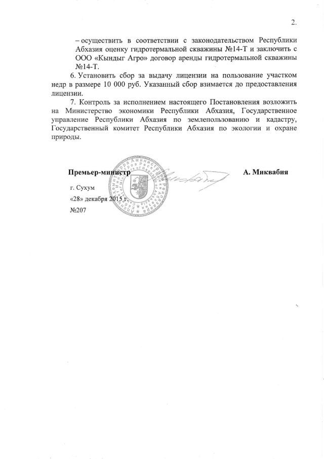 Постановление Кабинета Министров Республики Абхазия от 28.12.2015 № 207 "О предоставлении ООО "Кындыг Агро" права пользования участком недр для добычи термальных вод в селе Кындыг Очамчырского района"