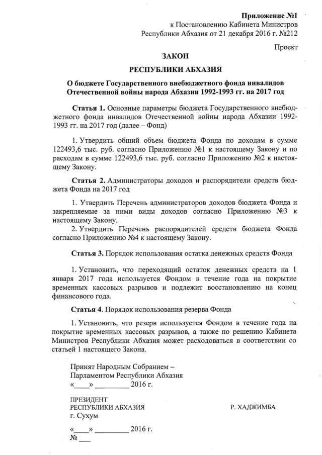 Постановление Кабинета Министров Республики Абхазия от 21.12.2016 № 212 "О проекте Закона Республики Абхазия "О бюджете Государственного внебюджетного фонда инвалидов Отечественной войны народа Абхазии 1992-1993 гг. на 2017 год>, утверждении штатного расписания и сметы расходов аппарата управления Государственного внебюджетного фонда инвалидов Отечественной войны народа Абхазии 1992-1993 гг. на 2017 год"