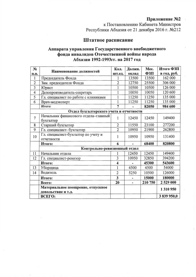 Постановление Кабинета Министров Республики Абхазия от 21.12.2016 № 212 "О проекте Закона Республики Абхазия "О бюджете Государственного внебюджетного фонда инвалидов Отечественной войны народа Абхазии 1992-1993 гг. на 2017 год>, утверждении штатного расписания и сметы расходов аппарата управления Государственного внебюджетного фонда инвалидов Отечественной войны народа Абхазии 1992-1993 гг. на 2017 год"