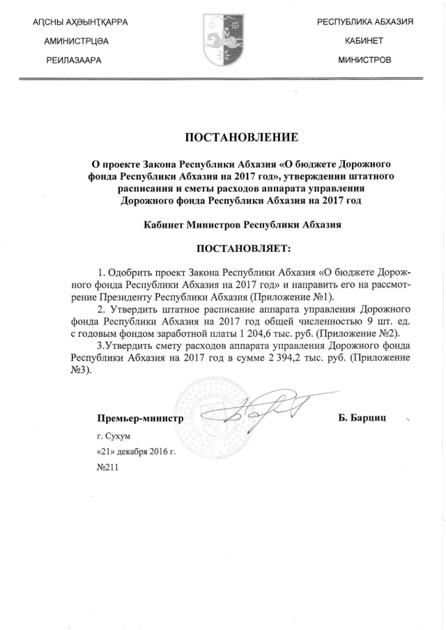 Постановление Кабинета Министров Республики Абхазия от 21.12.2016 № 211 "О проекте Закона Республики Абхазия "О бюджете Дорожного фонда Республики Абхазия на 2017 год", утверждении штатного расписания и сметы расходов аппарата управления Дорожного фонда Республики Абхазия на 2017 год"