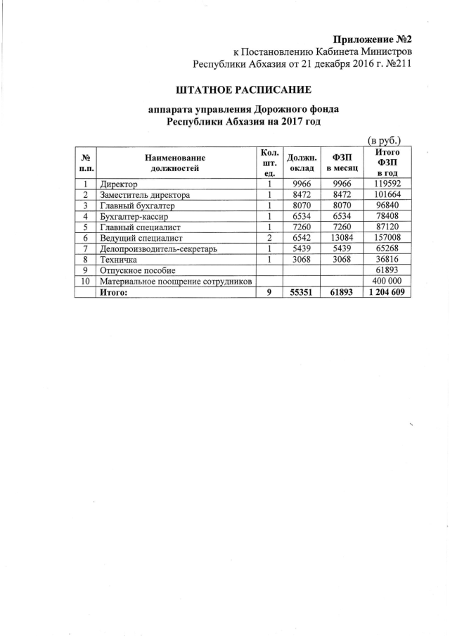 Постановление Кабинета Министров Республики Абхазия от 21.12.2016 № 211 "О проекте Закона Республики Абхазия "О бюджете Дорожного фонда Республики Абхазия на 2017 год", утверждении штатного расписания и сметы расходов аппарата управления Дорожного фонда Республики Абхазия на 2017 год"