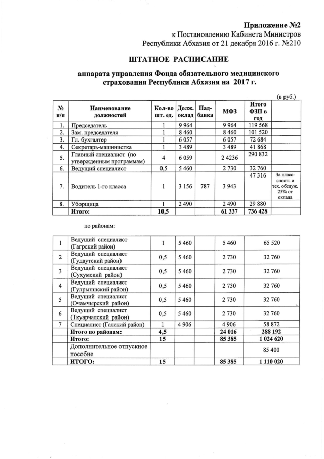Постановление Кабинета Министров Республики Абхазия от 21.12.2016 № 210 "О проекте Закона Республики Абхазия "О бюджете Фонда обязательного медицинского страхования Республики Абхазия на 2017 год", утверждении штатного расписания и сметы расходов аппарата управления Фонда обязательного медицинского страхования Республики Абхазия на 2017 год"
