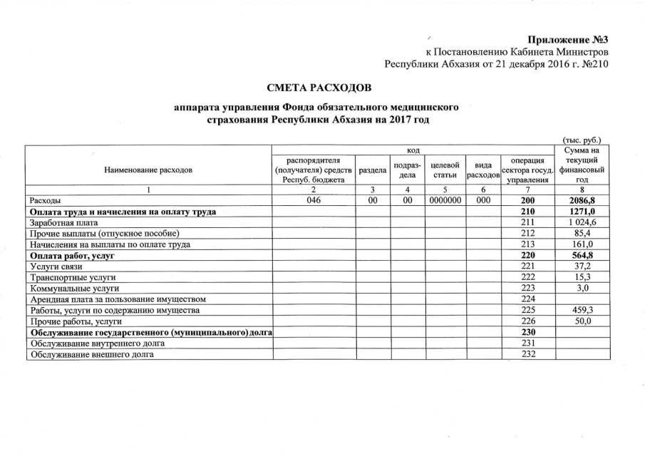 Постановление Кабинета Министров Республики Абхазия от 21.12.2016 № 210 "О проекте Закона Республики Абхазия "О бюджете Фонда обязательного медицинского страхования Республики Абхазия на 2017 год", утверждении штатного расписания и сметы расходов аппарата управления Фонда обязательного медицинского страхования Республики Абхазия на 2017 год"