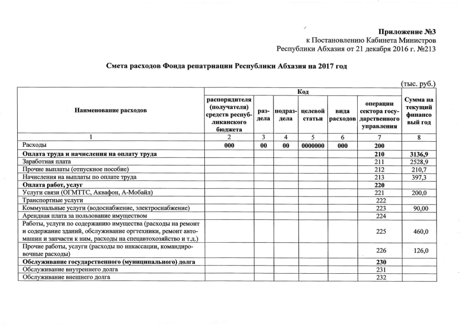 Постановление Кабинета Министров Республики Абхазия от 21.12.2016 № 213 "О проекте Закона Республики Абхазия "О бюджете Фонда репатриации Республики Абхазия на 2017 год", утверждении штатного расписания и сметы расходов аппарата управления и исполнительных органов Фонда репатриации Республики Абхазия на 2017 год"