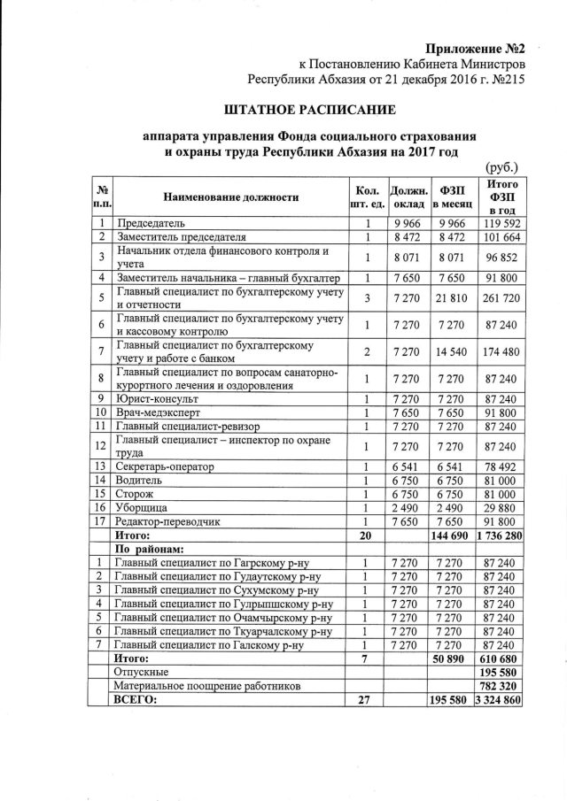 Постановление Кабинета Министров Республики Абхазия от 21.12.2016 № 215 "О проекте Закона Республики Абхазия "О бюджете Фонда социального страхования и охраны труда Республики Абхазия на 2017 год", утверждении штатного расписания и сметы расходов аппарата управления Фонда социального страхования и охраны труда Республики Абхазия на 2017 год"