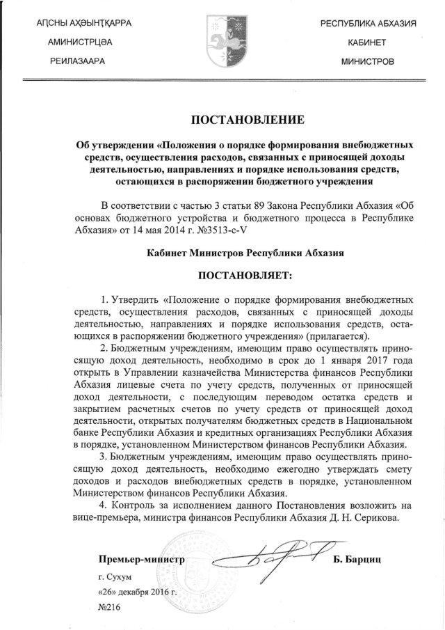 Постановление Кабинета Министров Республики Абхазия от 26.12.2016 № 216 "Об утверждении "Положения о порядке формирования внебюджетных средств, осуществления расходов, связанных с приносящей доходы деятельностью, направлениях и порядке использования средств, остающихся в распоряжении бюджетного учреждения"