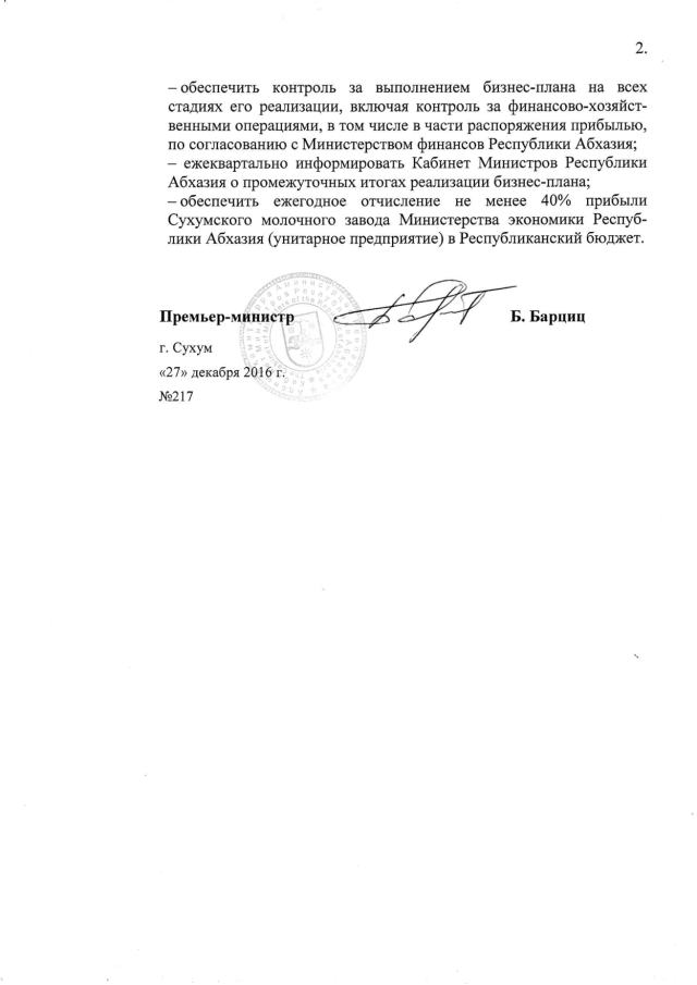 Постановление Кабинета Министров Республики Абхазия от 27.12.2016 № 217 "О предоставлении бюджетных инвестиций Сухумскому молочному заводу Министерства экономики Республики Абхазия (унитарное предприятие)"
