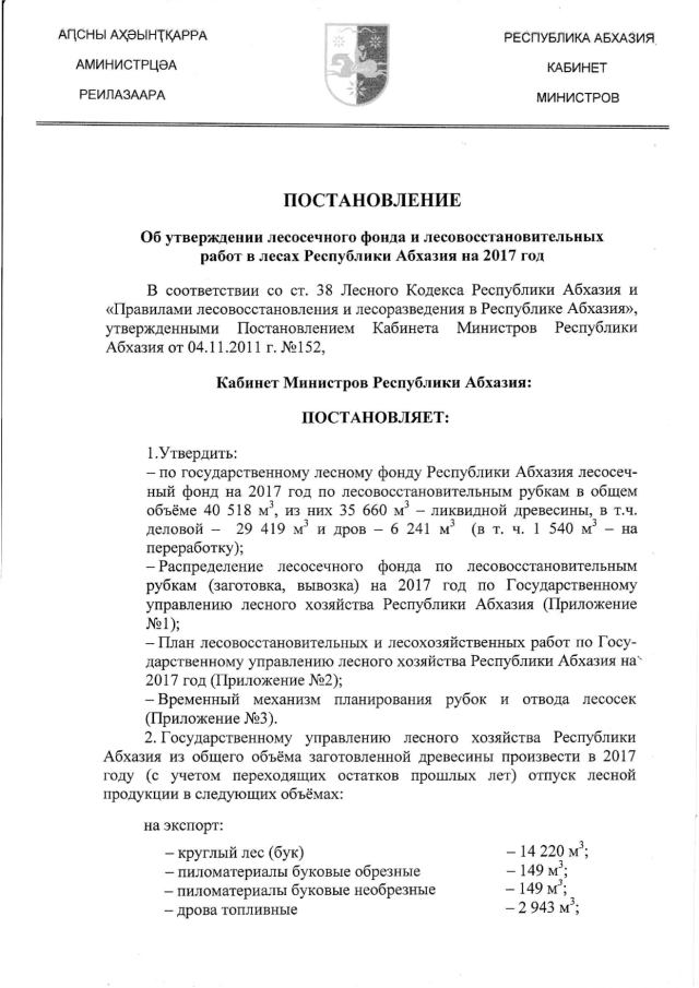 Постановление Кабинета Министров Республики Абхазия от 28.12.2016 № 228 "Об утверждении лесосечного фонда и лесовосстановительных работ в лесах Республики Абхазия на 2017 год"