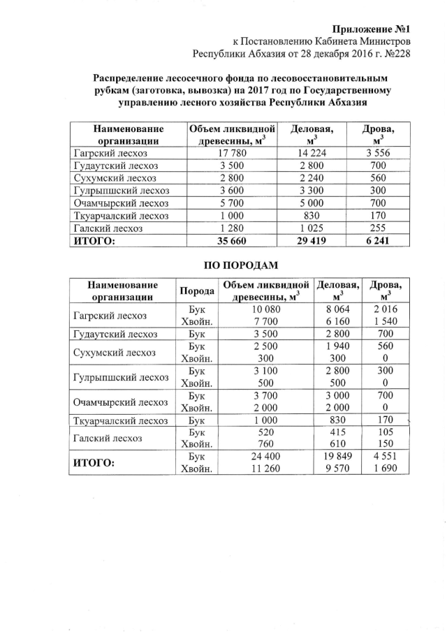 Постановление Кабинета Министров Республики Абхазия от 28.12.2016 № 228 "Об утверждении лесосечного фонда и лесовосстановительных работ в лесах Республики Абхазия на 2017 год"