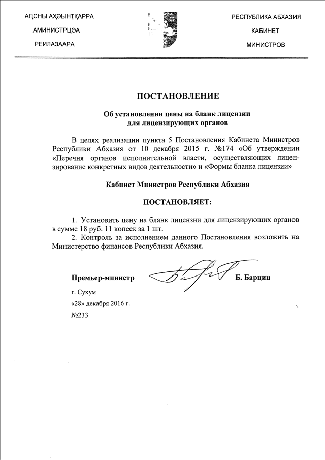 Постановление Кабинета Министров Республики Абхазия от 28.12.2016 № 233 "Об установлении цены на бланк лицензии для лицензирующих органов"
