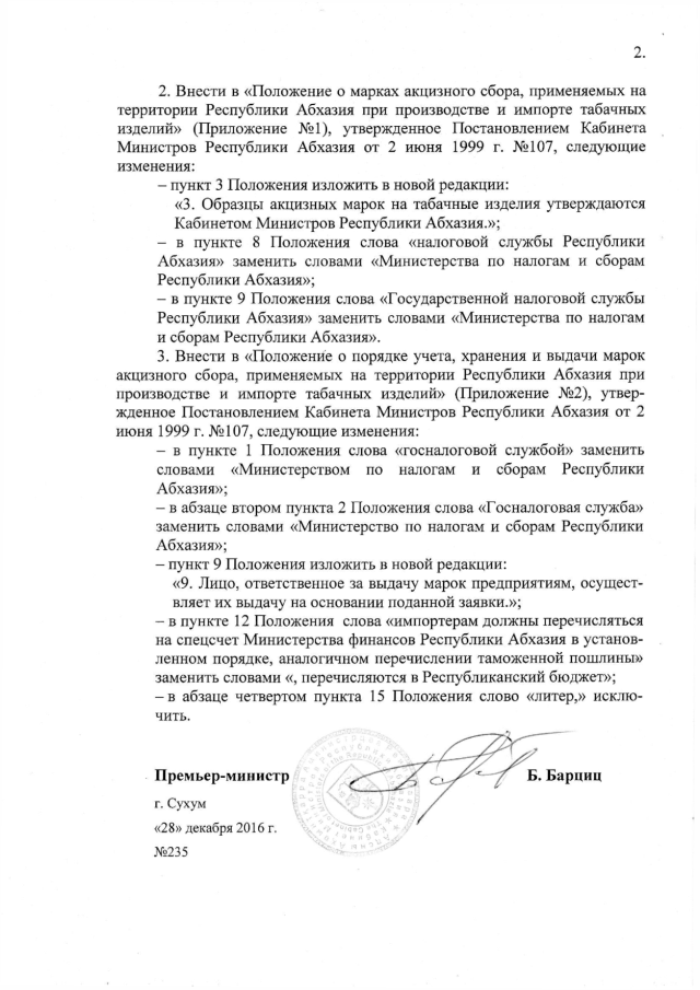 Постановление Кабинета Министров Республики Абхазия от 28.12.2016 № 235 "О внесении изменений в Постановление Кабинета Министров Республики Абхазия от 2 июня 1999 г. № 107 "Об упорядочении производства и реализации табачных изделий на территории Республики Абхазия"