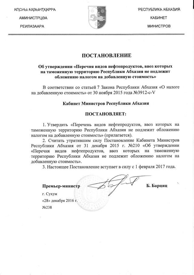 Постановление Кабинета Министров Республики Абхазия от 28.12.2016 № 238 "Об утверждении "Перечня видов нефтепродуктов, ввоз которых на таможенную территорию Республики Абхазия не подлежит обложению налогом на добавленную стоимость"