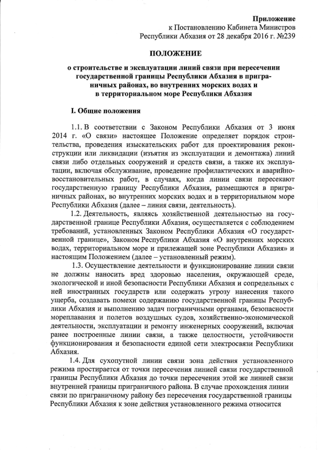 Постановление Кабинета Министров Республики Абхазия от 28.12.2016 № 239 "Об утверждении "Положения о строительстве и эксплуатации линий связи при пересечении государственной границы Республики Абхазия на приграничной территории, во внутренних морских водах и в территориальном море Республики Абхазия"